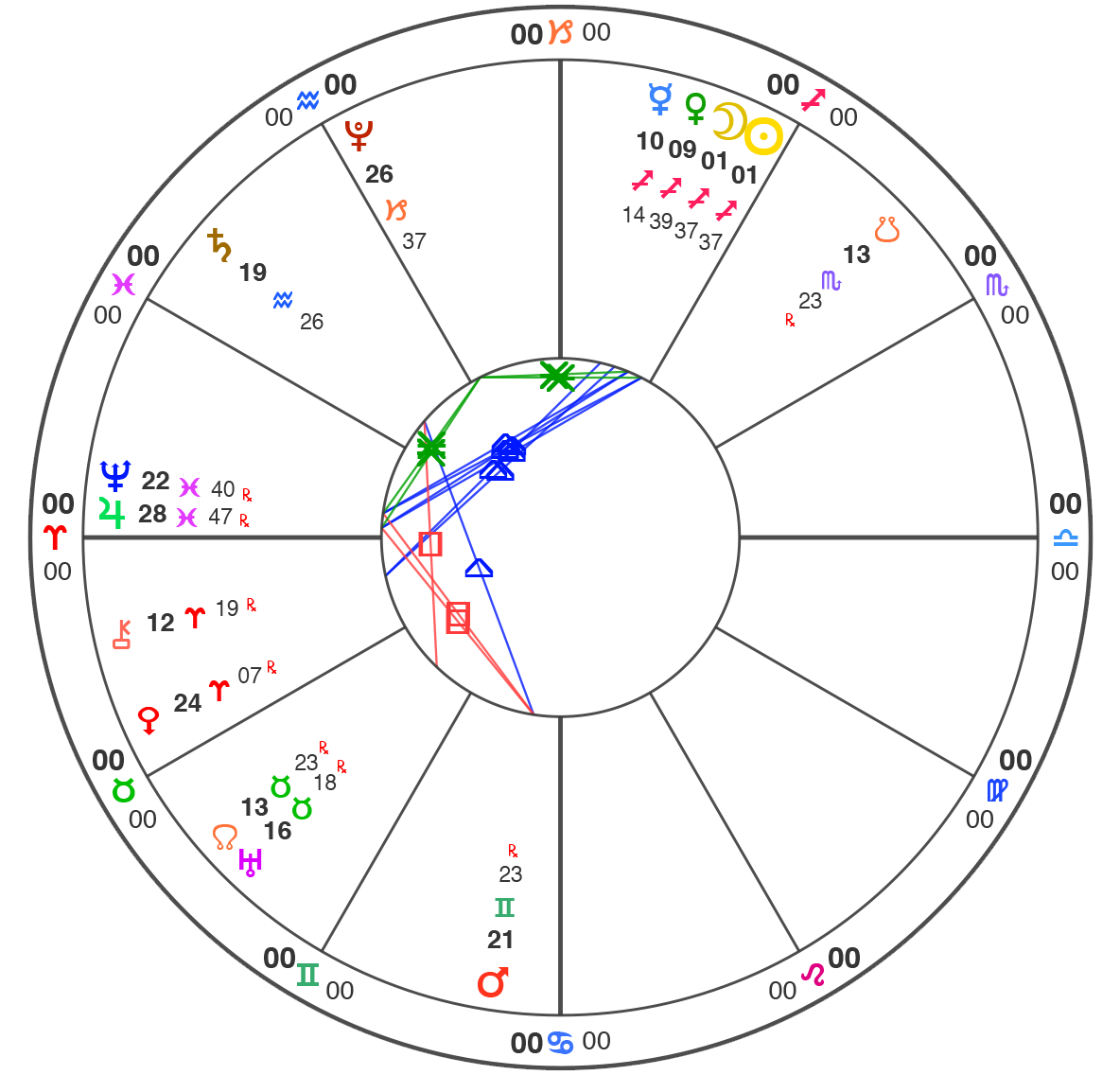 All charts here are using Natural House system: i.e. the Ascendant is always at 0˚ of Aries.