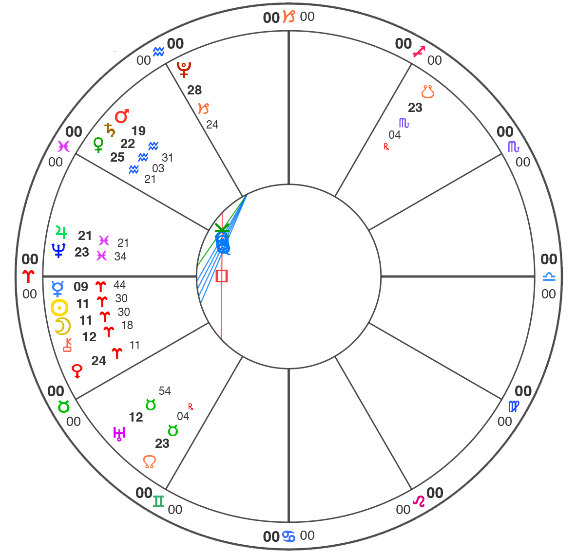 All charts here are using Natural House system: i.e. the Ascendant is always at 0˚ of Aries.