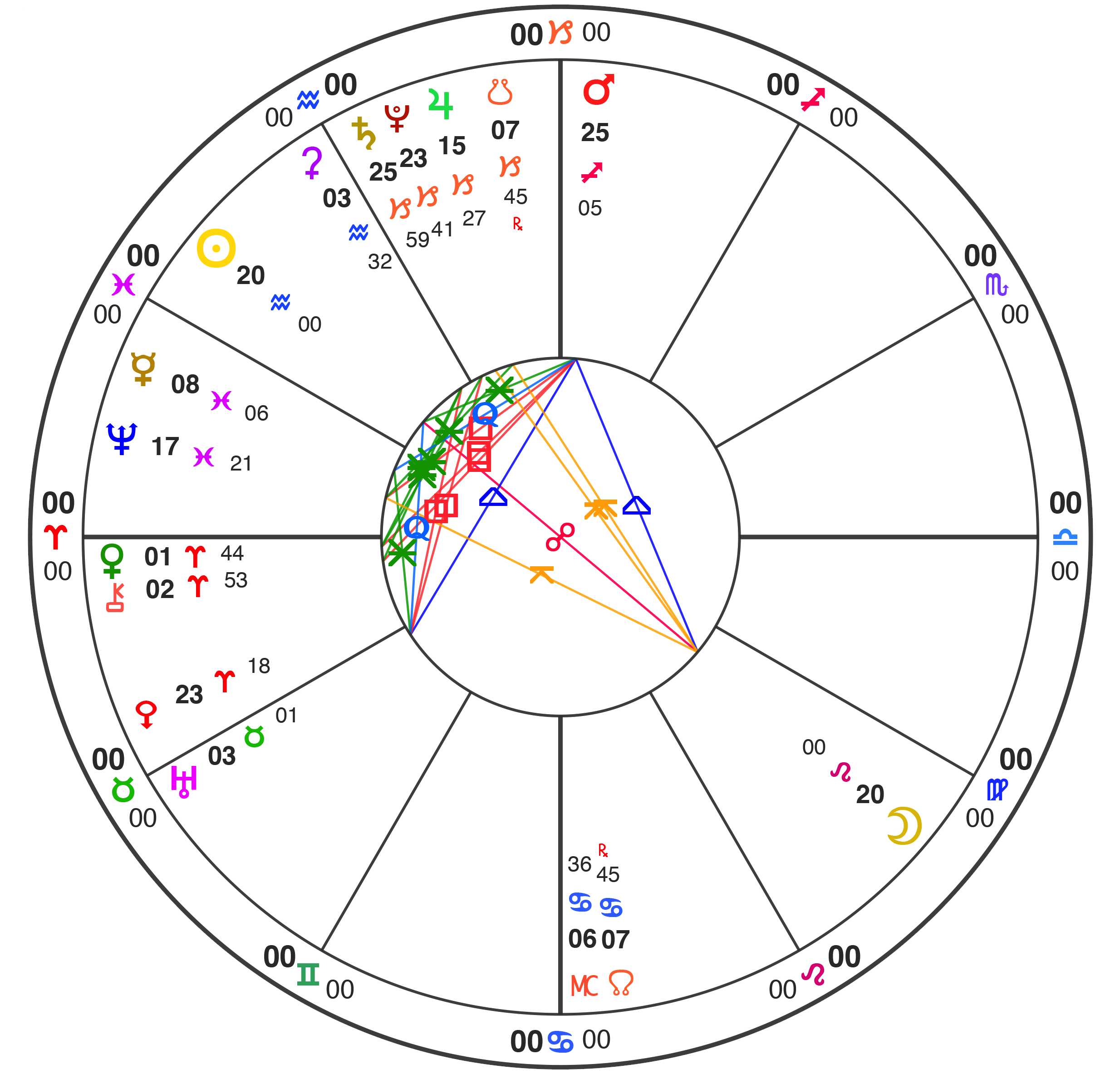 All charts here are using Natural House system: i.e. the Ascendant is always at 0˚ of Aries.