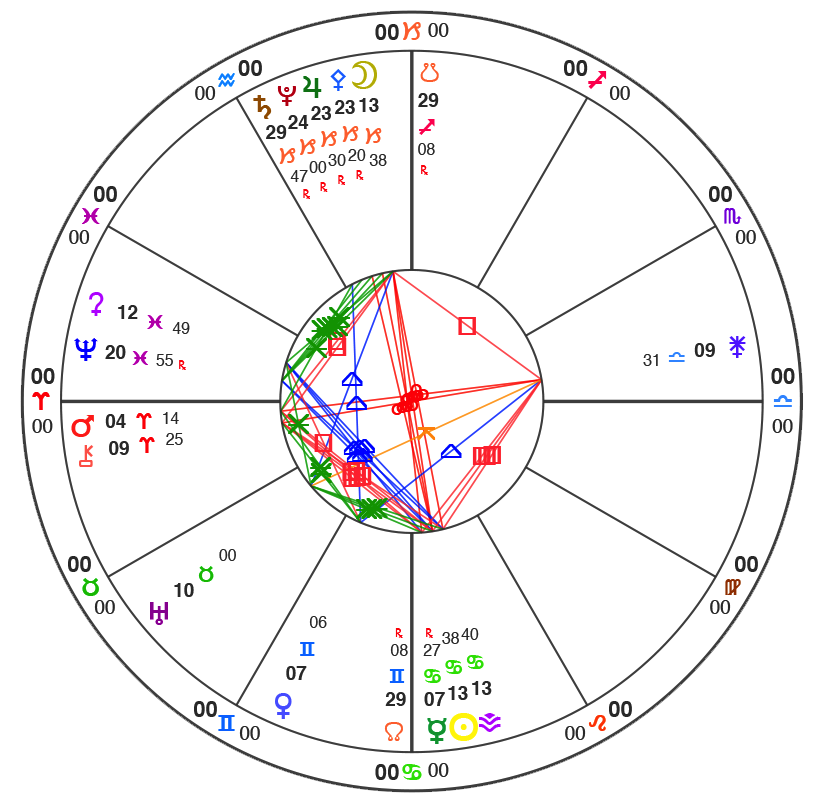 There’s a lot going on in this chart of the July 4th Lunar Eclipse. Looking at the stress lines in the chart (red lines) you can see there is what’s called a Grand Cross of planets, each at 90˚ angles to the others. 90˚ angles or squares in astrology terms, denote a lot of energy charging through the cosmic archetypal patterns, so much energy in fact, that a lot of things get shaken up, as tempers flare, misunderstandings happen (Mercury is still retro) and tensions and violence build.