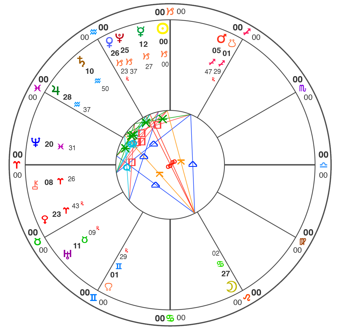 All charts here are using Natural House system: i.e. the Ascendant is always at 0˚ of Aries.