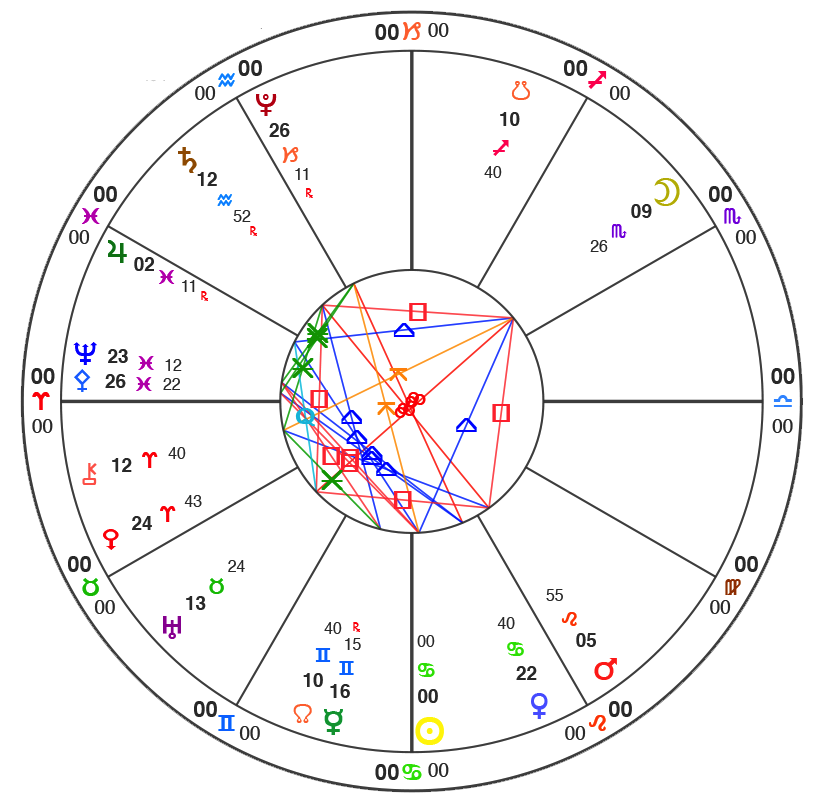 This chart has two major astrological features in it: a Grand Cross, and a Grand Trine.