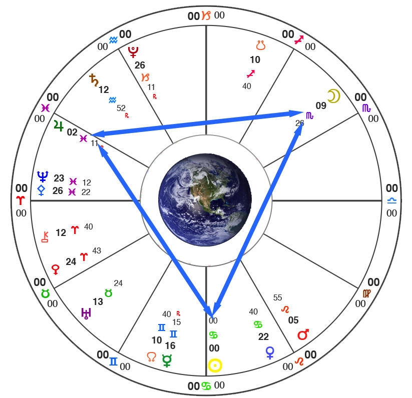 Enter the Grand Trine. Three planets all at 120˚ angles to each other form a giant triangle in the sky, holding the Earth in a container of strength and grace. Trines are harmonious aspects, energies that are coordinated such that an easy flow of energy is possible. In this case we have the Moon again as the linchpin (since it’s also part of the Grand Cross) which is trine to Jupiter in Pisces. Both Moon and Jupiter are trine to the newly minted (0˚) Sun in Cancer, at the “top of its form” so to speak.