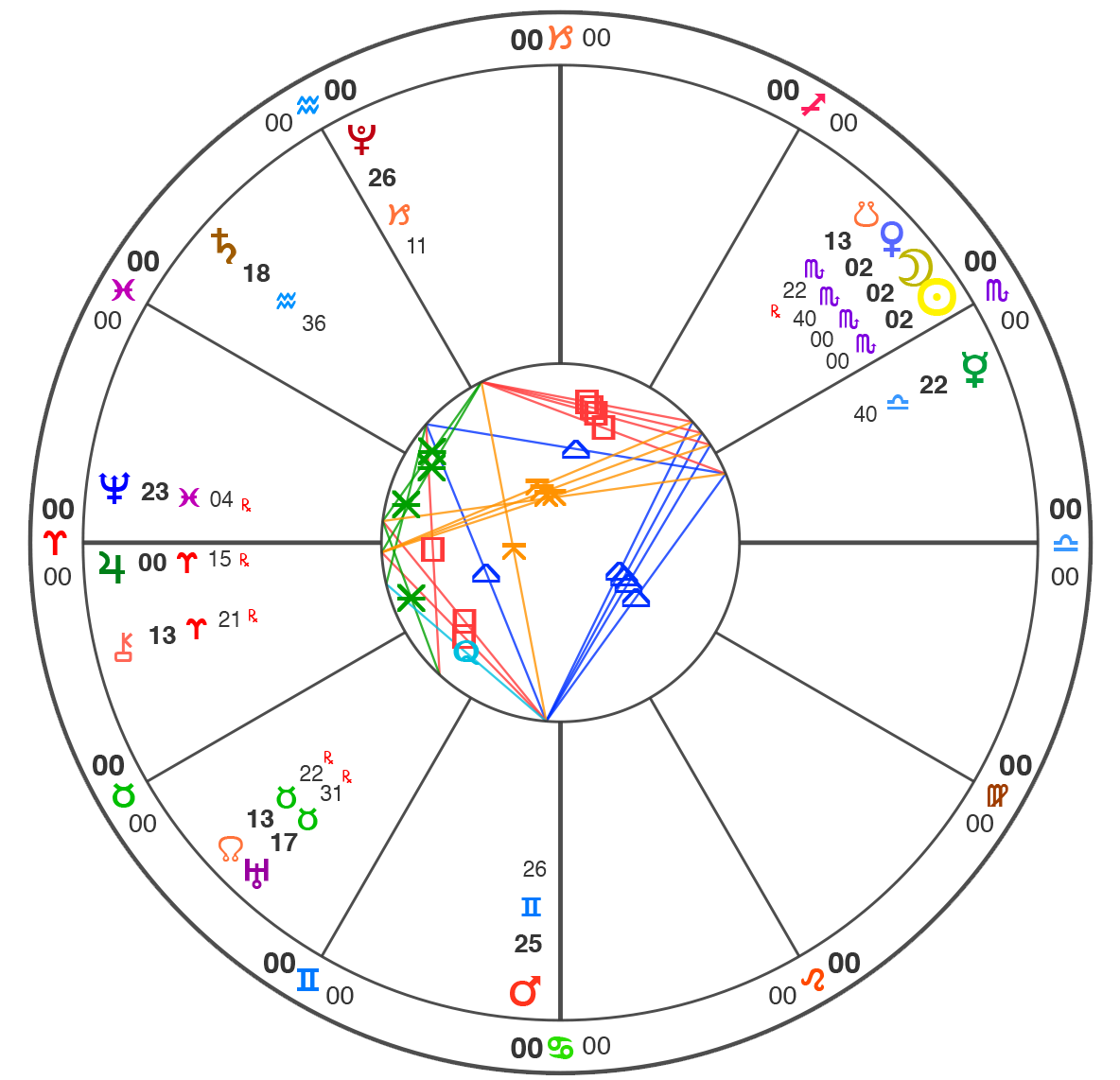 All charts here are using Natural House system: i.e. the Ascendant is always at 0˚ of Aries.